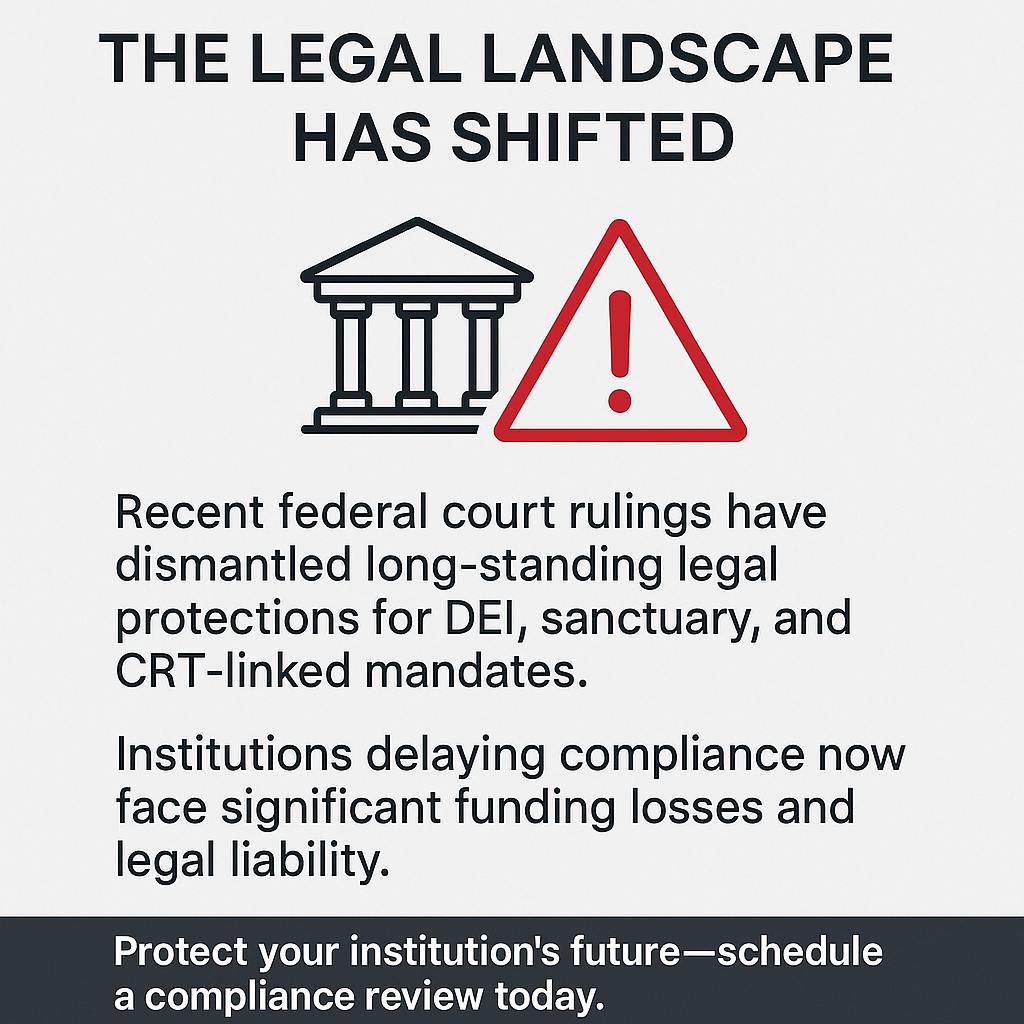 Recent federal court rulings have dismantled long-standing legal protections for DEI, sanctuary, and CRT-linked mandates. Institutions delaying compliance now face significant funding losses and legal liabilities.